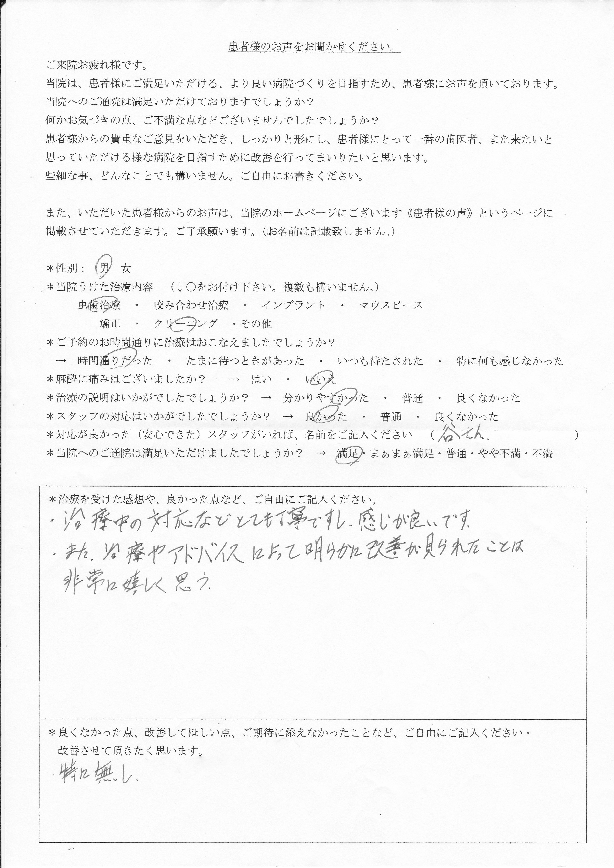 ご記入ありがとうございます。 治療や対応・説明など、ご満足いただけたようで、とても安心しております。また改善がみられたということ、こちらも大変嬉しく思います。今後も定期的なクリーニングや検診を行い、 きれいなお口の中を保っていきましょう。 何かございましたらお気軽にご連絡下さい。 お待ちしております。