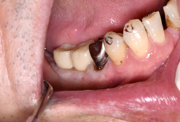 | インプラント 埋入後の歯肉 角化歯肉の減少が認められる。 |
