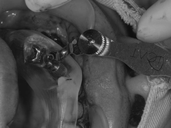 ②アイキャット専用の機材を用いて形成をします。サージカルガイドには事前に穴が空いてるので、形成時ずれることなく正確にドリリング(骨に穴をあけること)ができます。